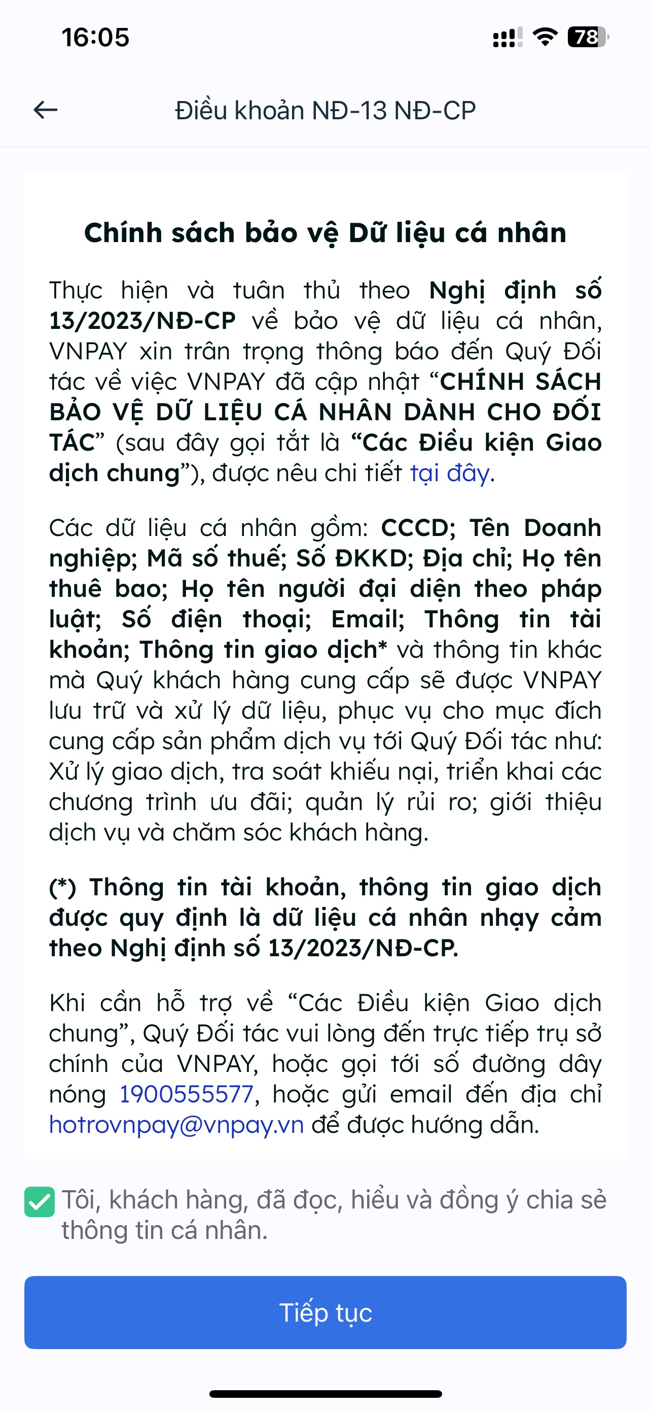 Bước 4: Đọc Chính sách bảo vệ dữ liệu cá nhân - Tích chọn vào ô “Tôi, khách hàng, đã đọc, hiểu và đồng ý chia sẻ thông tin cá nhân”, Chọn “Tiếp tục”